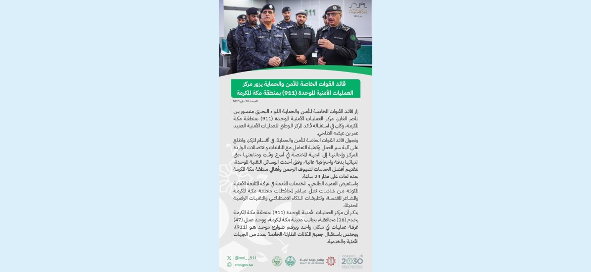 زار قائد القوات الخاصة للأمن والحماية اللواء البحري منصور بن ناصر الفايز مركز العمليات الأمنية الموحدة (911) بمنطقة مكة المكرمة، وكان في استقباله قائد المركز الوطني للعمليات الأمنية العميد عمر بن عيضه الطلحي.