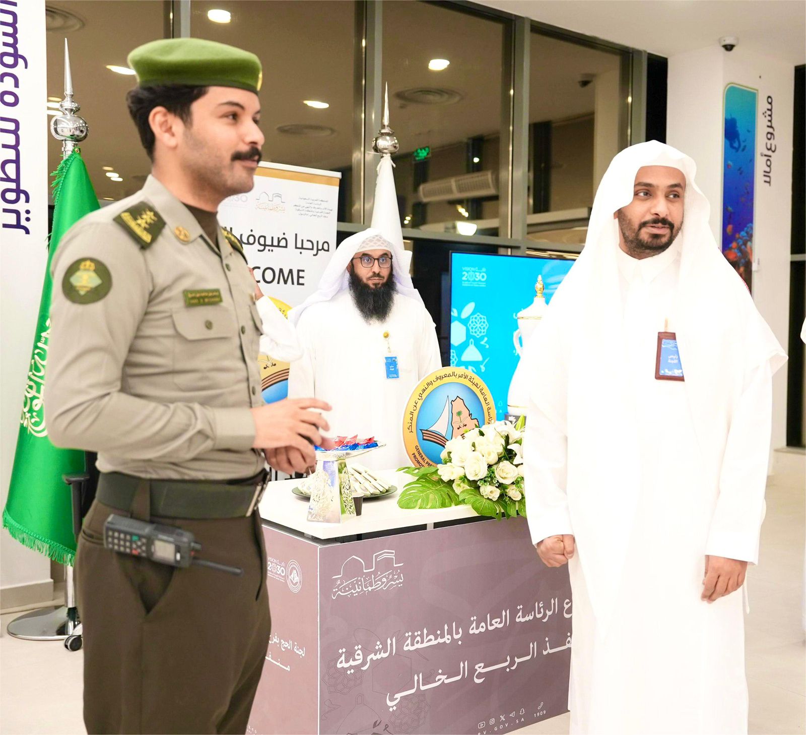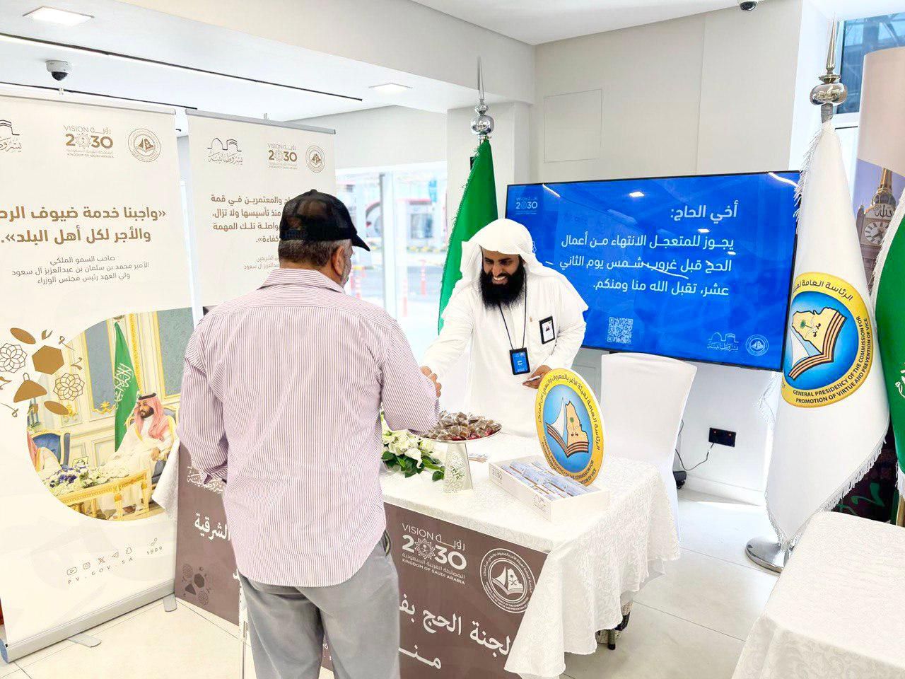 تستمر لجنة الحج بفرع الرئاسة العامة لهيئة الأمر بالمعروف والنهي عن المنكر بالمنطقة الشرقية في استقبال ضيوف الرحمن عبر منافذ: (البطحاء، و منفذ الربع الخالي، و منفذ سلوى، ومنفذ الرقعي، و منفذ جسر الملك فهد الحدودي).