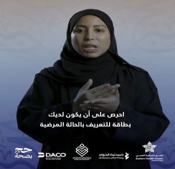 اطلقت جمعية الصم وضعاف السمع وذويهم بالمنطقة الشرقية ضمن برامجها ومبادراتها التوعوية والتثقيفية برنامجها التوعوي نصائح الحج بلغة الإشارة بالتعاون مع حملة تجمع الشرقية الصحي حج بصحة حيث تضمن البرنامج التثقفي إنتاج فيديوهات بلغة الإشارة تحوي إرشادات صحية لمن ينوي أداء مناسك الحج من الأشخاص ذوي الإعاقة في فئة الصم وضعاف السمع وكذلك المشاركة في توعية ضيوف الرحمن القادمين عبر المنافذ البرية والجوية وقد شملت هذه الرسائل التوعوية نصائح تتعلق بطرق الوقاية من ضربات الشمس وتعليمات للحجاج المصابين بالامراض المزمنة مع أهمية استشارة الطبيب قبل الذهاب لأداء مناسك الحج وضرورية توفر بطاقة للتعريف بالحالة المرضية وأهمية اشعار المصاحبين للاصم بمرضه والأدوية التي يستخدمها إلى جانب نصائح موجهة لمرضى القلب أثناء أداء مناسك الحج.