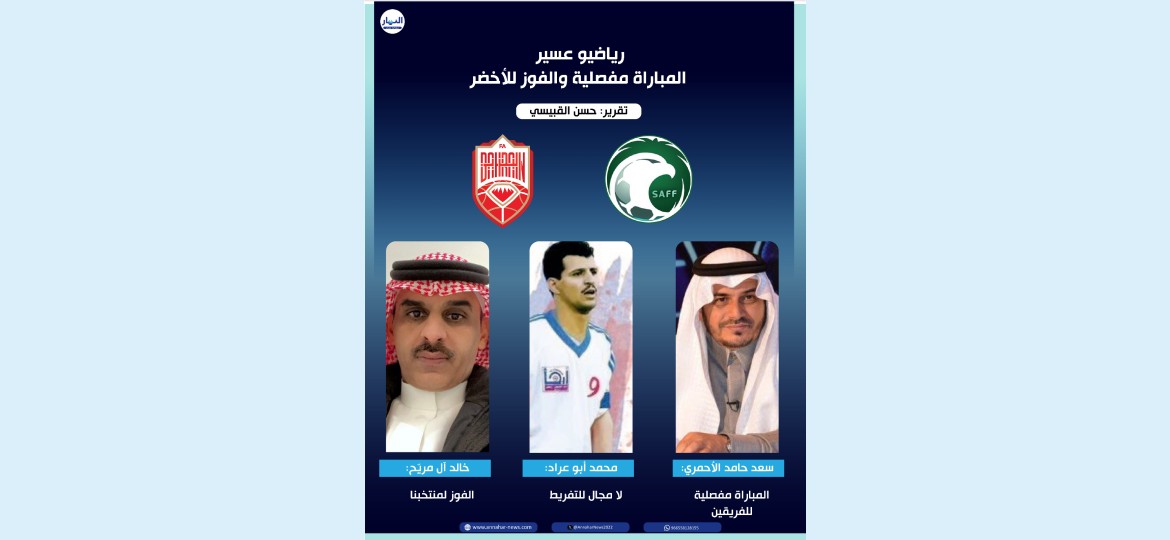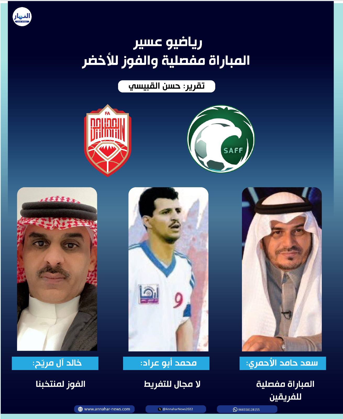 وأضاف بالطبع منتخبنا الوطني سيلعب ونصب عينيه الفوز ولاغير الفوز، وهذا ما سيحدث نتيجة مستواه الفني الأكثر تفوق وتميز من المنتخب البحريني، وسنفرح سوياً بإذن الله في تأهل الأخضر لكأس العالم 2026.