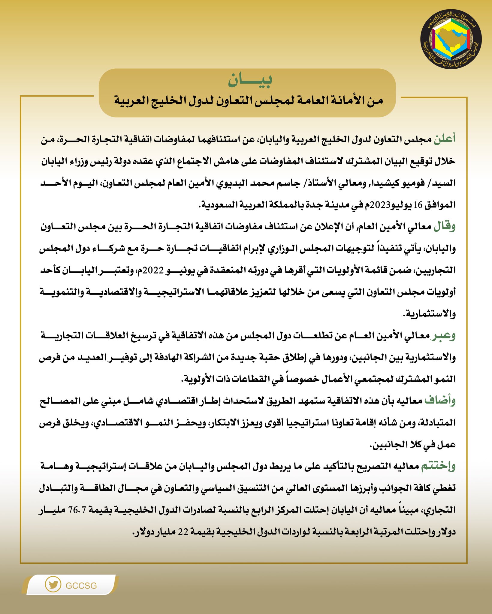 أعلن مجلس التعاون لدول الخليج العربية واليابان، عن استئنافهما لمفاوضات اتفاقية التجارة الحرة، من خلال توقيع البيان المشترك لاستئناف المفاوضات على هامش الاجتماع الذي عقده دولة رئيس وزراء اليابان السيد فوميو كيشيدا, ومعالي الأستاذ جاسم محمد البديوي الأمين العام لمجلس التعاون، اليوم الأحد الموافق 16 يوليو2023م، في مدينة جدة بالمملكة العربية السعودية.