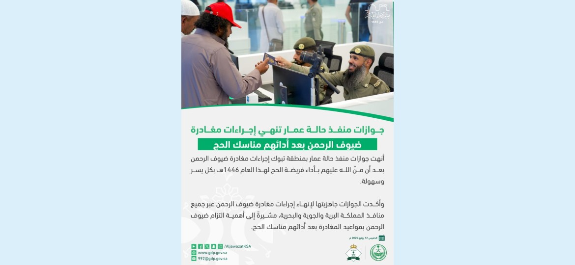 وأكّدت الجوازات جاهزيتها لإنهاء إجراءات مغادرة ضيوف الرحمن عبر جميع منافذ المملكة البرية والجوية والبحرية، مشيرةً إلى أهمية التزام ضيوف الرحمن بمواعيد المغادرة بعد أدائهم مناسك الحج.