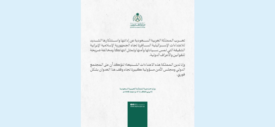 أعربت المملكة العربية السعودية عن إدانتها واستنكارها الشديد للاعتداءات الإسرائيلية السافرة تجاه الجمهورية الإسلامية الإيرانية الشقيقة التي تمس سيادتها وأمنها وتمثل انتهاكاً ومخالفة صريحة للقوانين والأعراف الدولية.