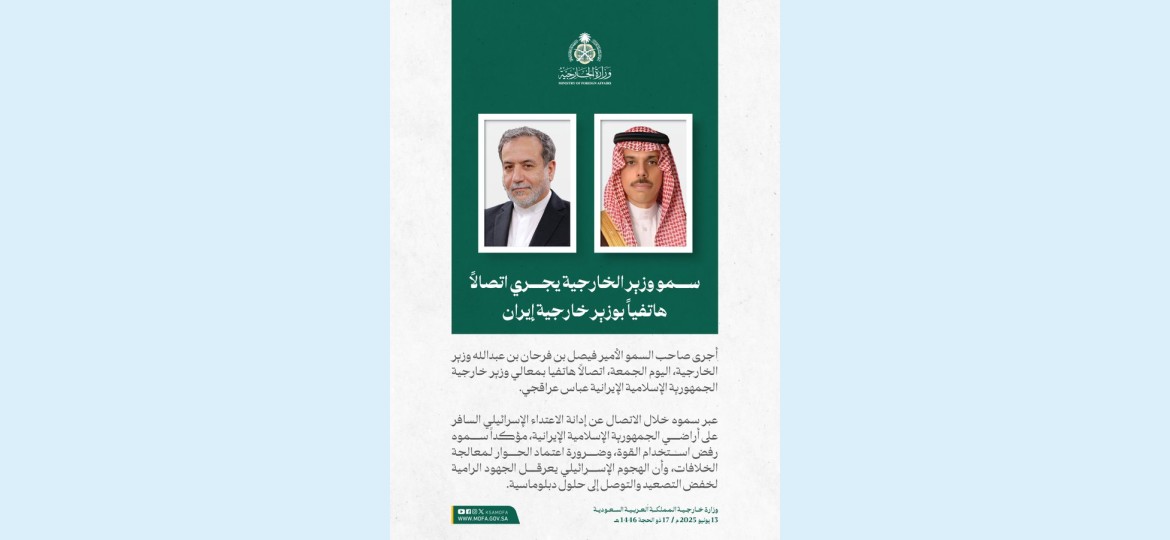 أجرى صاحب السمو الأمير فيصل بن فرحان بن عبدالله، وزير الخارجية، اتصالًا هاتفيًا اليوم الجمعة بمعالي وزير خارجية الجمهورية الإسلامية الإيرانية السيد عباس عراقجي.