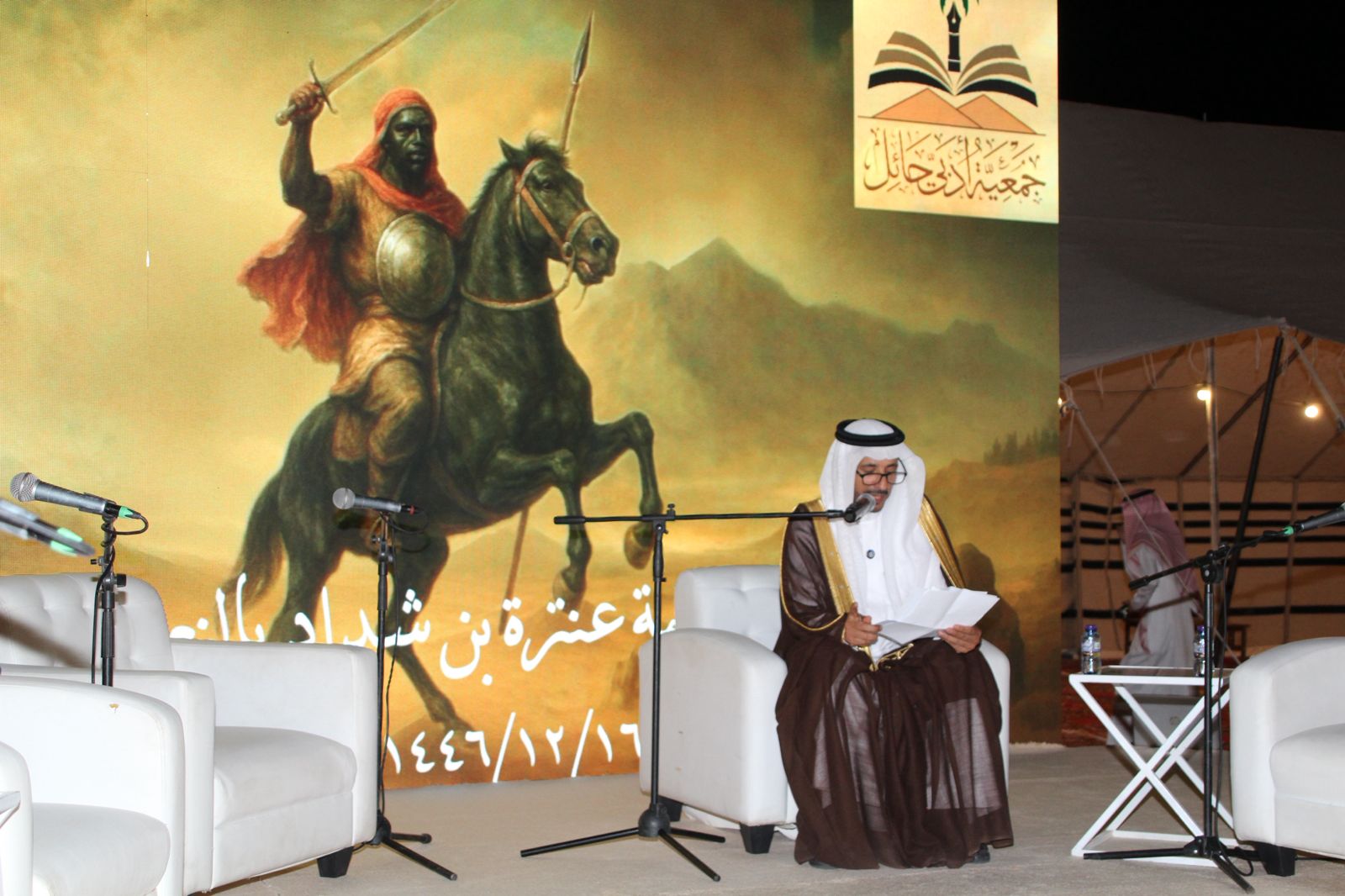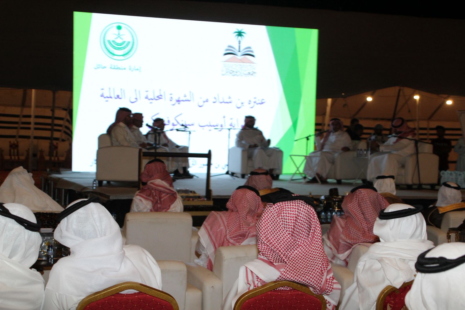 أقامت جمعية أدبي حائل مساء الخميس الماضي ملتقى ثقافياً بعنوان: "خيمة عنترة بن شداد"، وذلك في وسط بلدة النعي التاريخية، حيث تناول فيها ضيوف الأمسية سيرة الشاعر الفارس عنترة بن شداد العبسي، واستعرضوا خلالها صفحات من حياته، وتسليط الضوء على مآثره المكانية والإنسانية، من خلال شهادات أدبية وأكاديمية وتاريخية، بالإضافة إلى أبرز آثاره في النعي مثل: عين عنترة، وغاره، ومربط فرسه، وقبره، الذي يطل على العين العذبة التي لا تزال جارية.