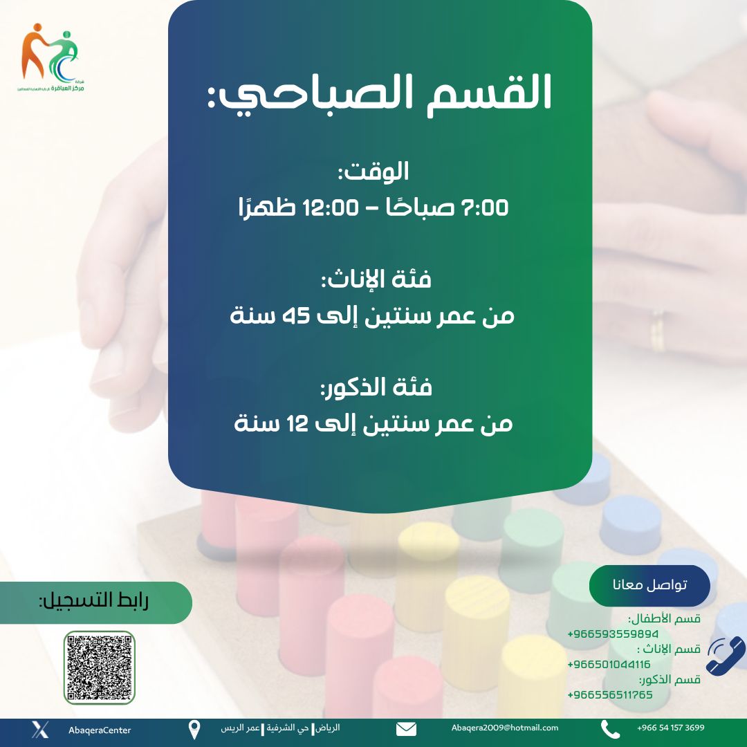 يعلن مركز العباقرة للرعاية النهارية عن فتح التسجيل والالتحاق بمراكز الرعاية النهارية الأهلية غير الحكومية (برنامج تحمل الدولة رسوم رعاية وتأهيل مستفيدي الأشخاص ذوي الإعاقة للعام التأهيلي 1447 هـ. حيث يقدم مركز العباقرة البر امج التأهيلية والعلاجية المتكاملة والتي تهدف إلى تنمية المهارات وتعزيز جودة الحياة لجميع فئات الإعاقة.