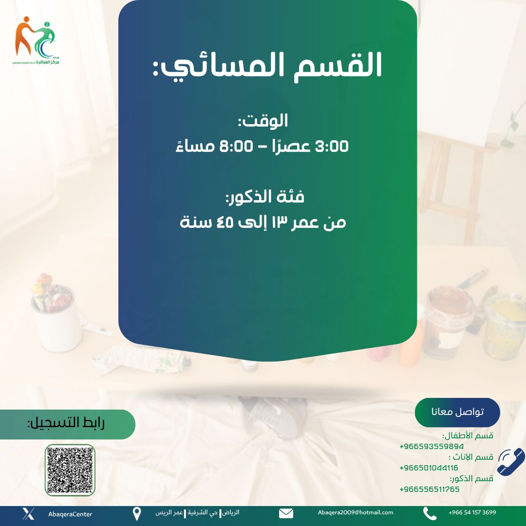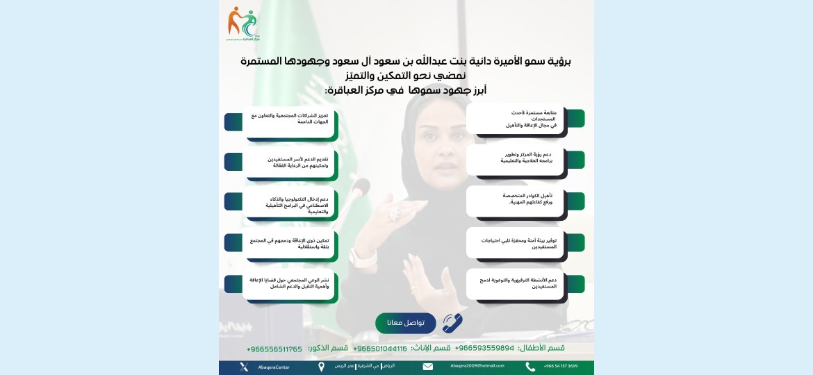 علما أن التسجيل للسعوديين سيكون مجاني و ذلك من خلال البوابة الإلكترونية لوزارة الموارد البشرية و التنمية الاجتماعية من خلال الرابط ( ESERVICES.MTSD.GOV.SA-#-) هذا و برؤية سمو الأميرة دانية بنت عبد الله بن سعود آل سعود و جهودها المستمرة للمضي نحو التمكين و التميز و التي من أبرز جهودها في مركز العباقرة المتايعة المستمرة لأحدث المستجدات في مجال الرعاية و التأهيل ، دعم رؤية المركز و تطوير برامجه العلاجية و التعليمية ، و تأهيل الكوادر المتخصصة و رفع كفاءتهم المهنية و توفير بيئة آمنة و محفزة تلبي احتياجات المستفيدين و دعم الأنشطة الترفيهية و التوعوية لدمجهم و تعزيز الشراكات المجتمعية و التعاون مع الجهات الداعمة و تقديم الدعم لأسر المستفيدين و تمكينهم من الرعاية الفعالة .