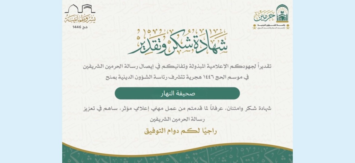 كرمت رئاسة الشؤون الدينية بالمسجد الحرام والمسجد النبوي "صحيفة النهار"، بمنحها شهادة شكر وتقدير، عرفانًا بجهودها الإعلامية المتميزة خلال موسم حج 1446هـ.