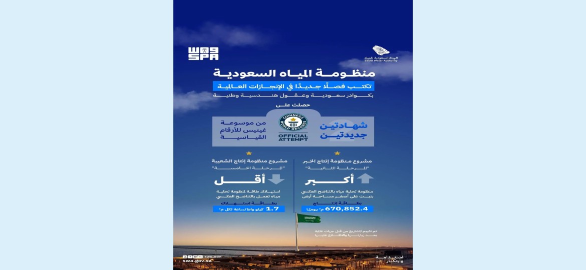 وتُعزز الهيئة بهذه الأرقام سجلها الحافل في الإنجازات القياسية التي سجلتها موسوعة غينيس رسميًا، بعدما كانت قد سجلت تسعة أرقام قياسية سابقة، ليصل إجمالي ما حققته من إنجازات موثّقة في الموسوعة العالمية إلى أحد عشر رقمًا قياسيًا عالميًا، بما يعكس مكانة المملكة بصفتها مركزًا عالميًّا للتميز والمعرفة في قطاع المياه، ودورها الحيوي في رسم ملامح مستقبل مائي أكثر استدامة.