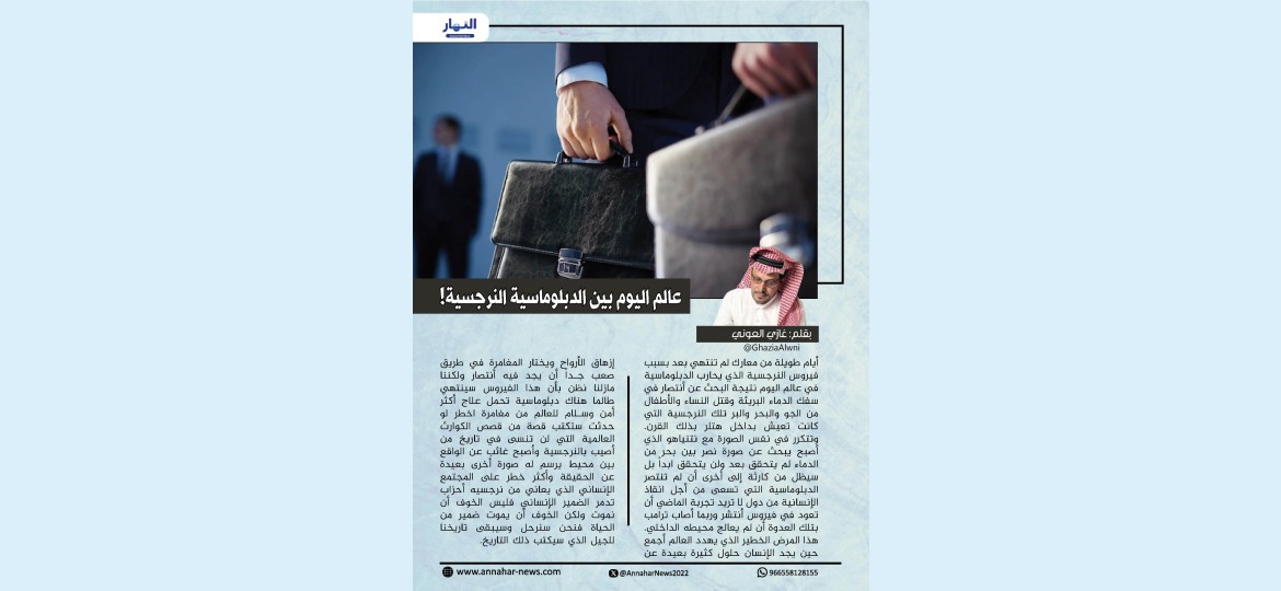 هذا المرض الخطير الذي يهدد العالم أجمع حين يجد الإنسان حلول كثيرة بعيدة عن إزهاق الأرواح ويختار المغامرة في طريق صعب جداً أن يجد فيه أنتصار ولكننا مازلنا نظن بأن هذا الفيروس سينتهي طالما هناك دبلوماسية تحمل علاج أكثر أمن وسلام للعالم من مغامرة اخطر لو حدثت ستكتب قصة من قصص الكوارث العالمية التي لن تنسى في تاريخ من أصيب بالنرجسية وأصبح غائب عن الواقع بين محيط يرسم له صورة أخرى بعيدة عن الحقيقة وأكثر خطر على المجتمع الإنساني الذي يعاني من نرجسيه أحزاب تدمر الضمير الإنساني فليس الخوف أن نموت ولكن الخوف أن يموت ضمير من الحياة فنحن سنرحل وسيبقى تاريخنا للجيل الذي سيكتب ذلك التاريخ.