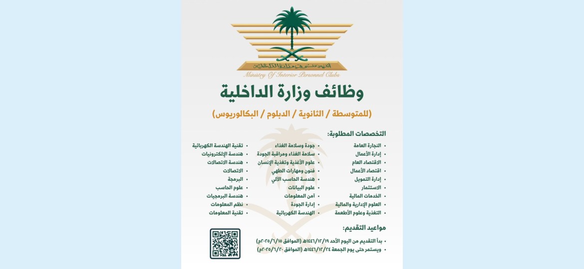 أعلنت الإدارة العامة لأندية منسوبي وزارة الداخلية عن توفر مجموعة من الوظائف الشاغرة في مجالات فنية وإدارية مختلفة بعدد من مدن المملكة.
