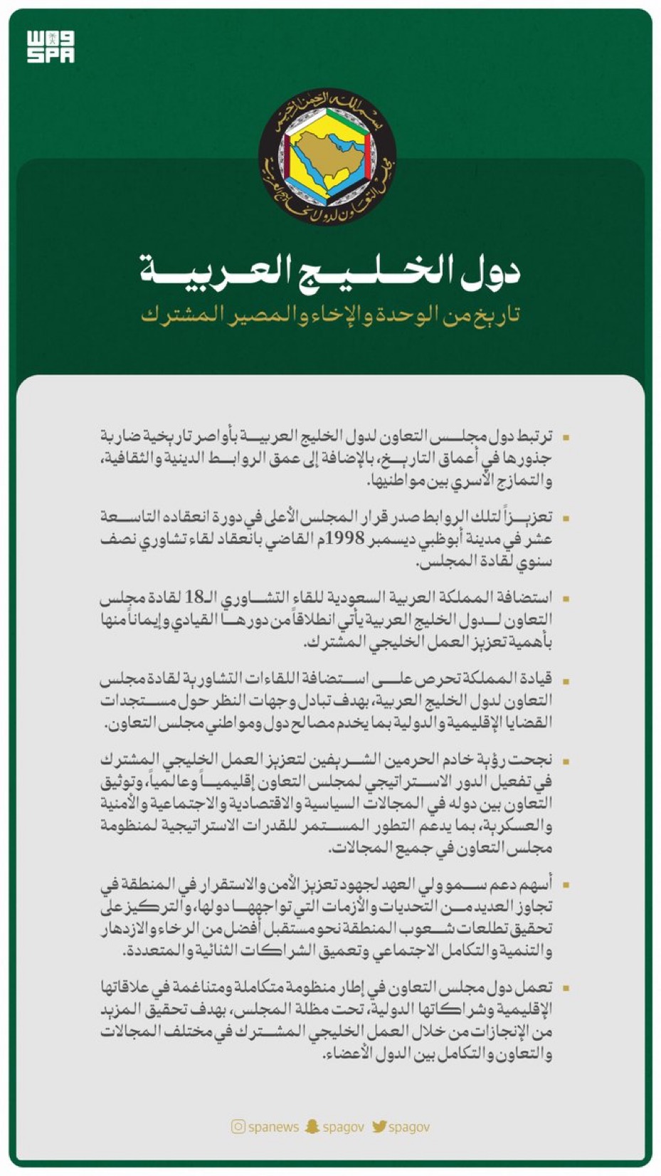ترتبط دول مجلس التعاون لدول الخليج العربية بأواصر ضاربة جذورها في أعماق التاريخ، بالإضافة إلى عمق الروابط الدينية والثقافية، والتمازج الأسري بين مواطنيها، وهي في مجملها عوامل تقارب وتوحد؛ عززتها الرقعة الجغرافية المنبسطة عبر البيئة الصحراوية الساحلية التي تحتضن سكان هذه المنطقة.