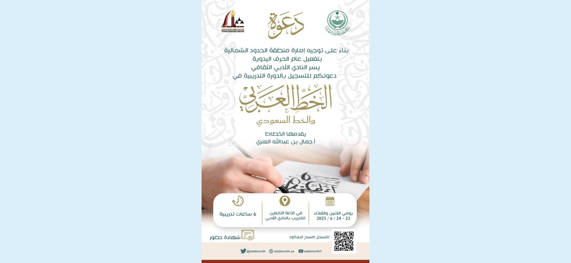 أعلن النادي الأدبي الثقافي بمنطقة الحدود الشمالية عن تنظيم دورة تدريبية في الخط العربي والخط السعودي، وذلك تفعيلًا لعام الحِرف اليدوية، استجابة لتوجيه إمارة المنطقة.