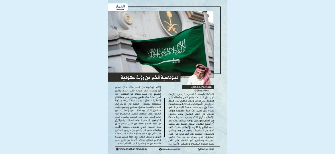 قامت الدبلوماسية السعودية بعمل جبار من أجل حل النزاعات ونشر الأمن والسلام بكل ماتملك من قدرات وثقل عالمي بين جميع الدول في الأمم المتحدة وتلك المهمة ليست سهلة بل هى أصعب مهمة للإنسانية التي تحتاج إلى تغيير إرث أفكار متطرفة مازالت تعيش في الفكر العالمي حين يتجاهل الإنسان حقوق الأخر بسبب عنصرية جعلت من العالم يعود في دوامة من الصراعات بعد أن أصبح القانون الدولي رهينة فكر متمرد على الواقع والقانون الإنساني سجين خلف أسوار من التعقيدات بسبب من يعادي الأمن والاستقرار ويبحث عن الصراعات من فكره المتطرف الذي يبحث به عن أمن عكس.