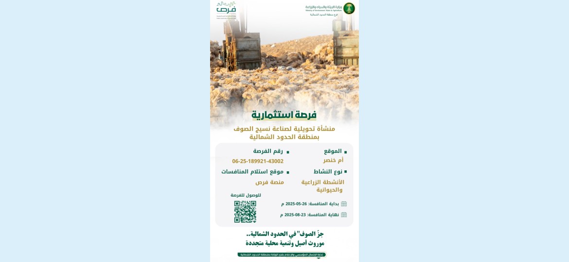 أعلن فرع وزارة البيئة والمياه والزراعة بمنطقة الحدود الشمالية عن طرح فرصة استثمارية متميزة في مدينة عرعر، تتمثل في إنشاء منشأة تحويلية لصناعة نسيج الصوف، وذلك ضمن جهود الوزارة الهادفة إلى تعزيز التنمية المحلية ورفع كفاءة الاستفادة من الموارد الطبيعية في المنطقة.