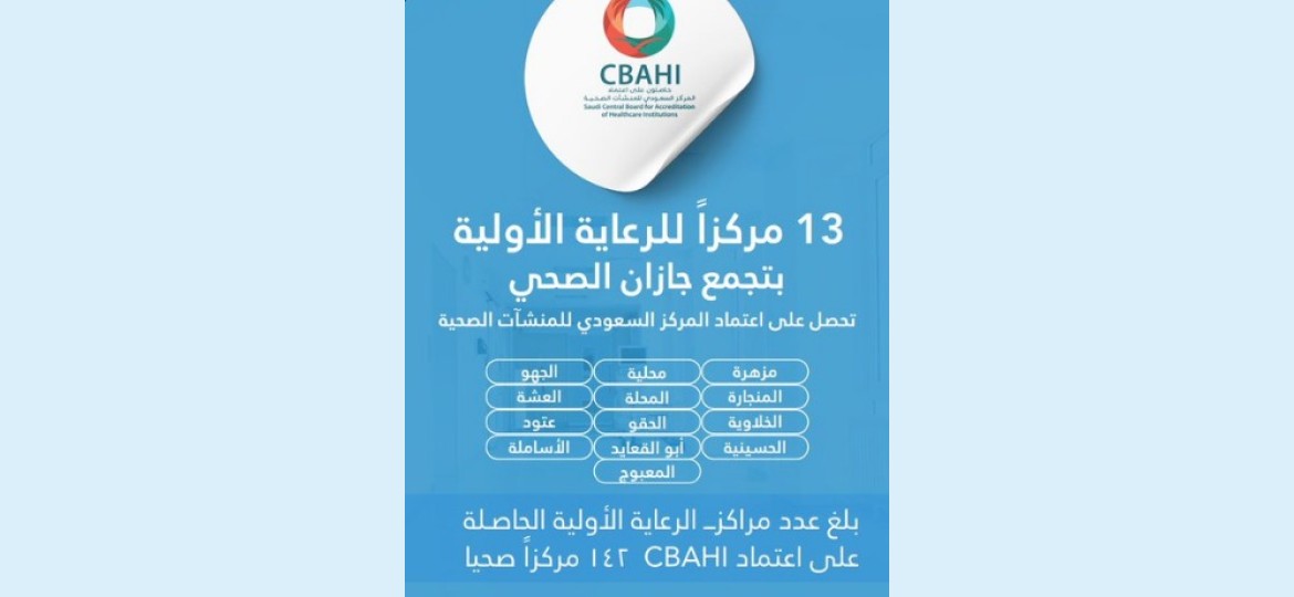 حصلت (13) منشأة صحية تابعة لتجمع جازان الصحي على اعتماد المركز السعودي لاعتماد المنشآت الصحية "سباهي CBAHI "، بعد أن استوفت جميع معايير الجودة وسلامة المرضى، وذلك ضمن جهود التجمع لتعزيز كفاءة وجودة خدمات الرعاية الصحية الأولية في المنطقة.