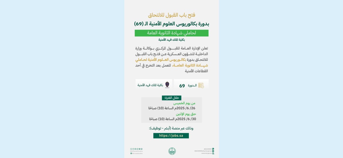 أعلنت الإدارة العامة للقبول المركزي بوكالة وزارة الداخلية للشؤون العسكرية، فتح باب القبول للالتحاق بدورة بكالوريوس العلوم الأمنية لحاملي شهادة الثانوية العامة الـ (69) بكلية الملك فهد الأمنية للعمل بعد التخرج في أحد القطاعات الأمنية، خلال الفترة من يوم الخميس 1/ 1/ 1447هـ الموافق 26/ 6/ 2025م الساعة (10) صباحًا، حتى يوم الاثنين 5/ 1/ 1447هـ الموافق 30/ 6/ 2025م الساعة (10) صباحًا، وذلك عبر منصة (أبشر - توظيف) https://jobs.sa.