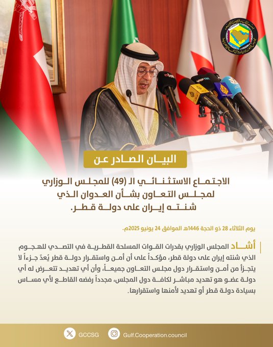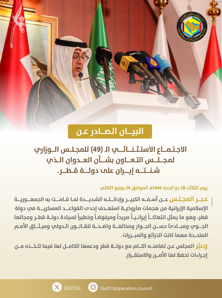 أدان المجلس الوزاري لمجلس التعاون لدول الخليج العربية بشدة الهجوم الصاروخي الذي شنّته الجمهورية الإسلامية الإيرانية على إحدى القواعد العسكرية في دولة قطر، مؤكدًا أنه يُشكّل انتهاكًا صارخًا لسيادة  قطر  ومجالها الجوي، ومخالفة صريحة للقانون الدولي وميثاق الأمم المتحدة، ومبادئ حسن الجوار، وذلك خلال اجتماعه الاستثنائي الـ49 الذي عُقد يوم الثلاثاء الموافق 24 يونيو 2025.