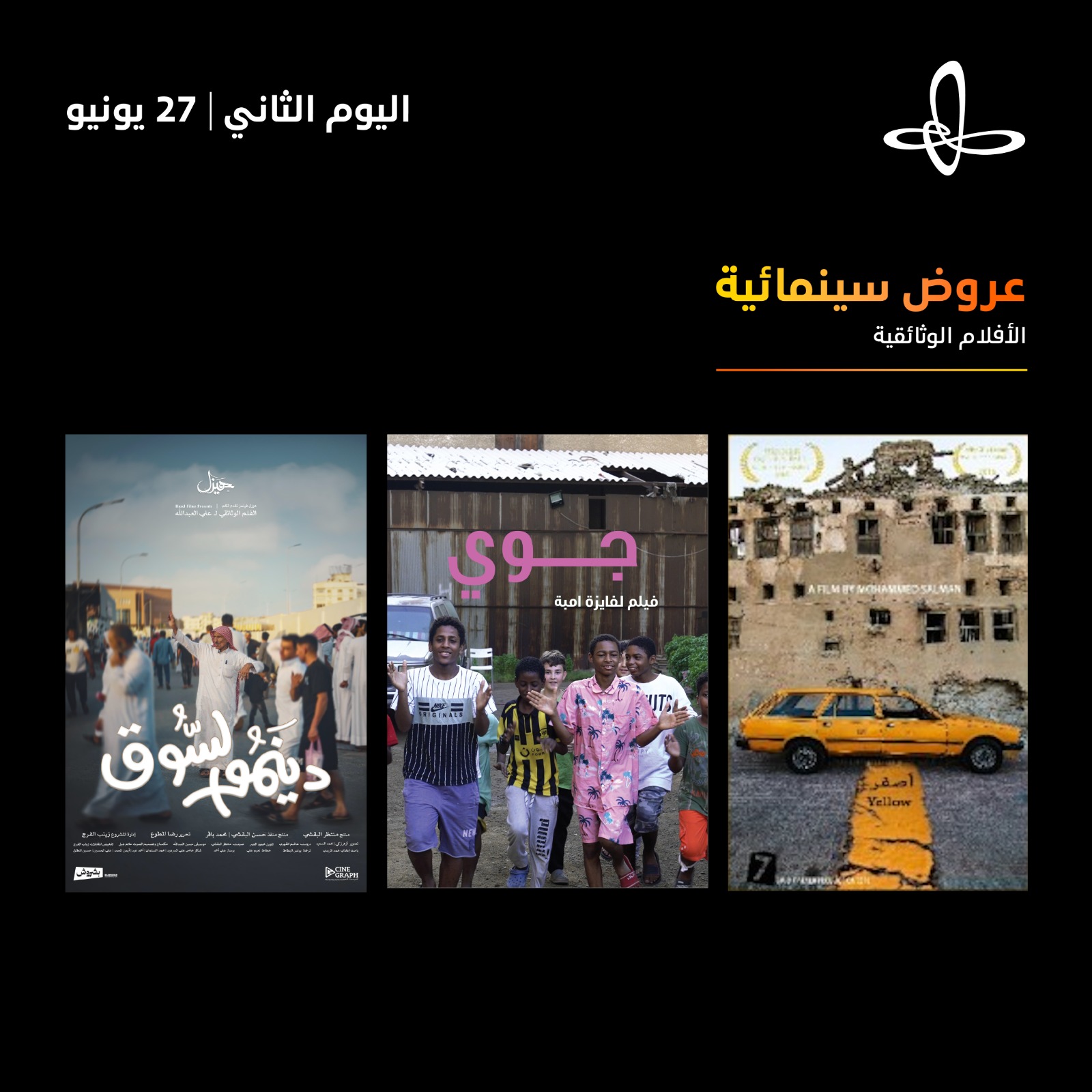 وفي اليوم الثاني، يركّز البرنامج على الوثائقي، حيث تُعرض ثلاثة أفلام تنقل نبض الشارع، وتلامس تفاصيل الواقع السعودي من زوايا مختلفة. يبدأ العرض بفيلم "جوي" للمخرجة فايزة أمبا، متتبعًا تجربة ثلاثة فتيان مع مشروع “سينما الحارة” في جدة، يليه فيلم "دينمو السوق" لعلي باقر، الذي يرصد يومًا من حياة رجل ستيني يعمل دلالًا في سوق الحراج، ثم فيلم "أصفر" للمخرج محمد سلمان، الذي يستعيد مشهد سيارات الأجرة الصفراء بوصفها علامة زمنية منقرضة.