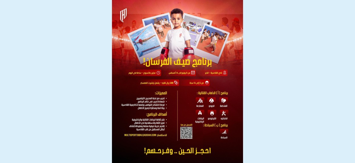 يشار إلى أن برنامج صيف الفرسان، امتدادًا لرسالة القادسية المجتمعية، بتوفير أنشطة رياضية نوعية خلال الصيف، تُسهم في تعزيز نمط الحياة الصحية، وفتح آفاق مستقبلية للناشئين في مجالات رياضية متعددة.