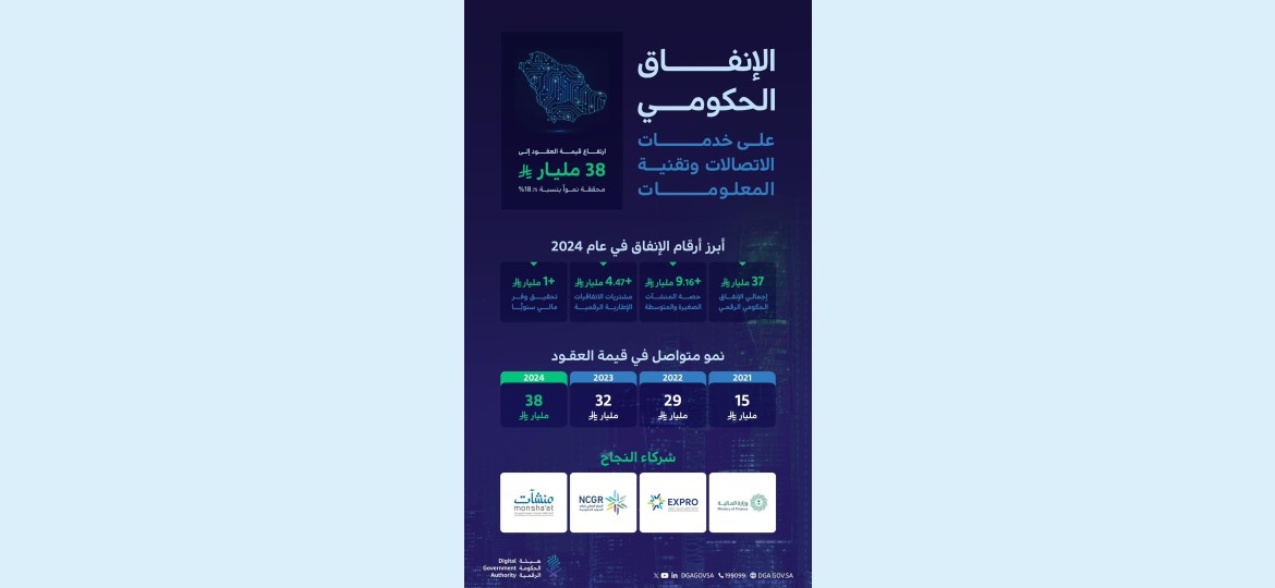 أصدرت هيئة الحكومة الرقمية تقرير الإنفاق الحكومي على خدمات الاتصالات وتقنية المعلومات لعام (2024)، حيث بلغت قيمة العقود الحكومية الجديدة حوالي (38) مليار ريال، محققة نموًّا بنسبة (18.75%) مقارنة بعام (2023).