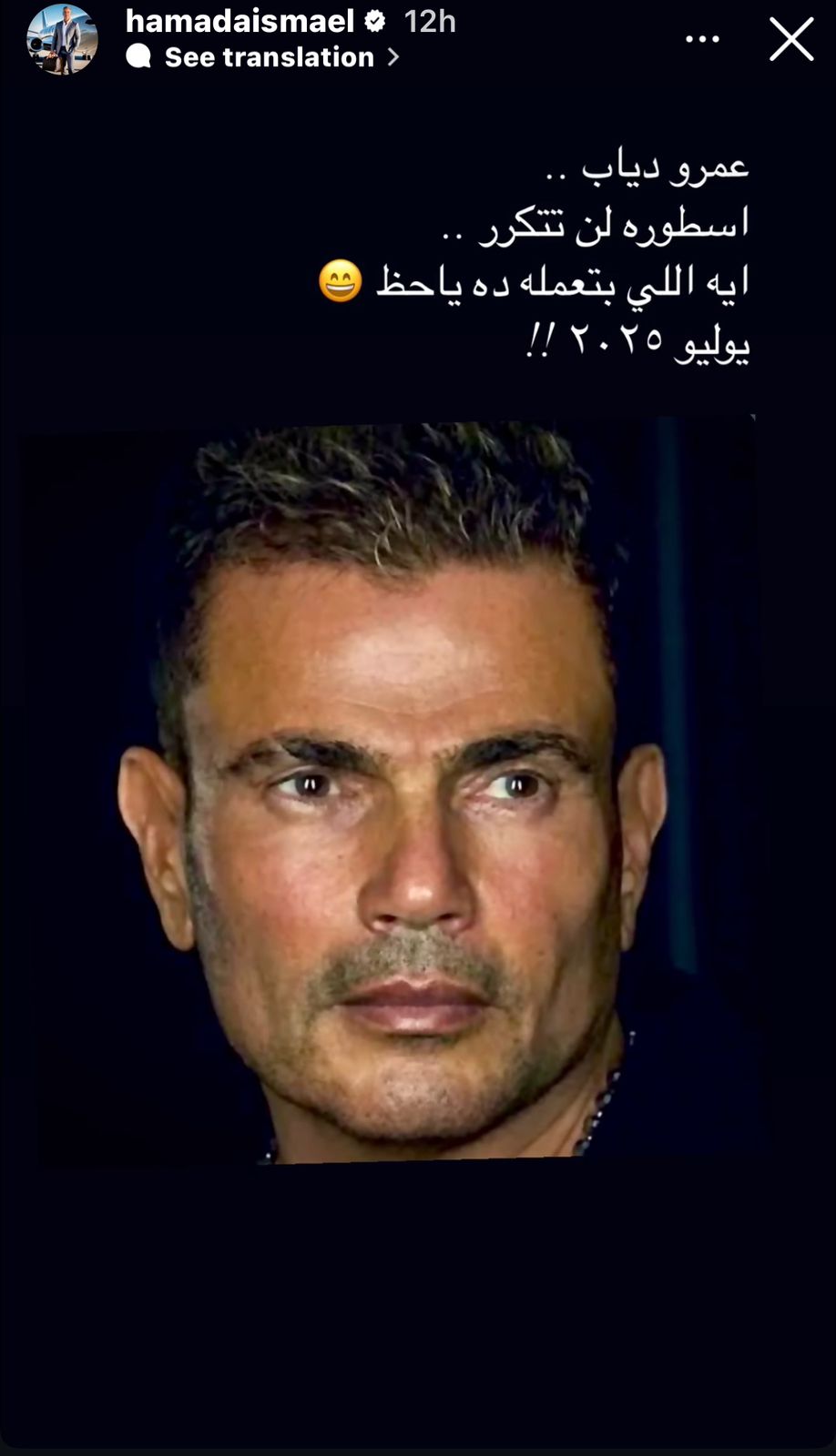 نشر المنتج حماده إسماعيل منشورًا عبر حسابه على موقع التواصل الاجتماعي "انستاجرام" عبّر فيه عن إعجابه الشديد بالنجم الكبير عمرو دياب، وكتب: "عمرو دياب أسطورة لن تتكرر.. إيه اللي بتعمله ده يا حظ!”، وذلك بالتزامن مع الحملة الترويجية التي أطلقها الهضبة لأحدث ألبوماته المنتظرة “ابتدينا”، معبًّرًا عن إعجابه الكامل بألبوم الهضبة الجديد المقرر طرحه في يوليو المقبل.