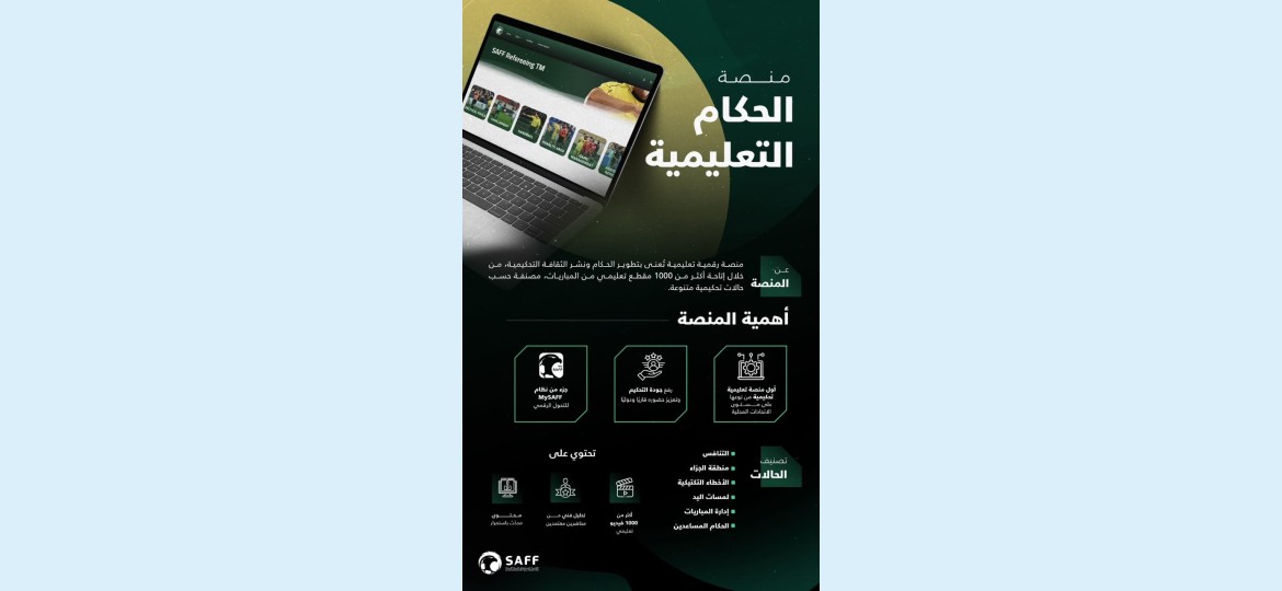 أطلق الاتحاد السعودي لكرة القدم منصة الحكام التعليمية، والتي تعد مرجع تعليمي رقمي متخصص في تطوير أداء الحكام ونشر الثقافة التحكيمية على المستويين المحلي والإقليمي الدولي، من خلال إتاحة أكثر من 1000 فيديو تعليمي من المباريات، مصنفة حسب حالات تحكيمية متنوعة.