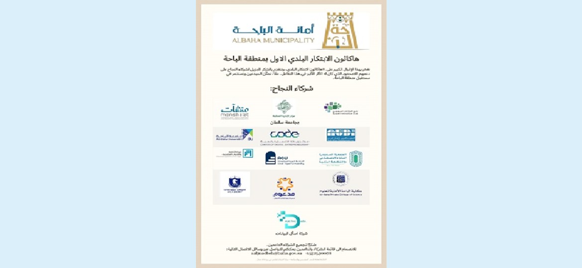 تنطلق اليوم الأحد الموافق 29 يونيو 2025م فعاليات "هاكاثون الابتكار البلدي الأول" بمنطقة الباحة، والذي تنظمه أمانة منطقة الباحة برعاية من الجمعية السعودية للذكاء الاصطناعي والأنظمة الذكية بجامعة الملك سعود، ويستمر لمدة يومي الأحد والاثنين 29 – 30 يونيو 2025م، ويهدف إلى تعزيز الابتكار التقني في الخدمات البلدية.