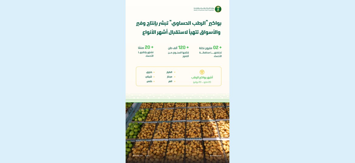 تشهد  محافظة الأحساء  تباشير جني المزارعين لبواكير الرطب مع مطلع فصل الصيف وارتفاع درجات الحرارة، خلال الفترة من (20 مايو – 20 يوليو 2025م)، حيث بدأت أسواق المملكة تتهيأ لاستقبال أكثر من (20) صنفًا من أشهر أنواع الرطب التي تنتجها المحافظة، وتتصدرها (الخلاص، الشيشي، الغر).