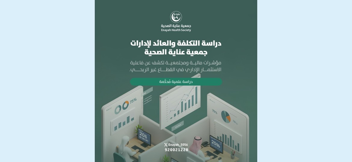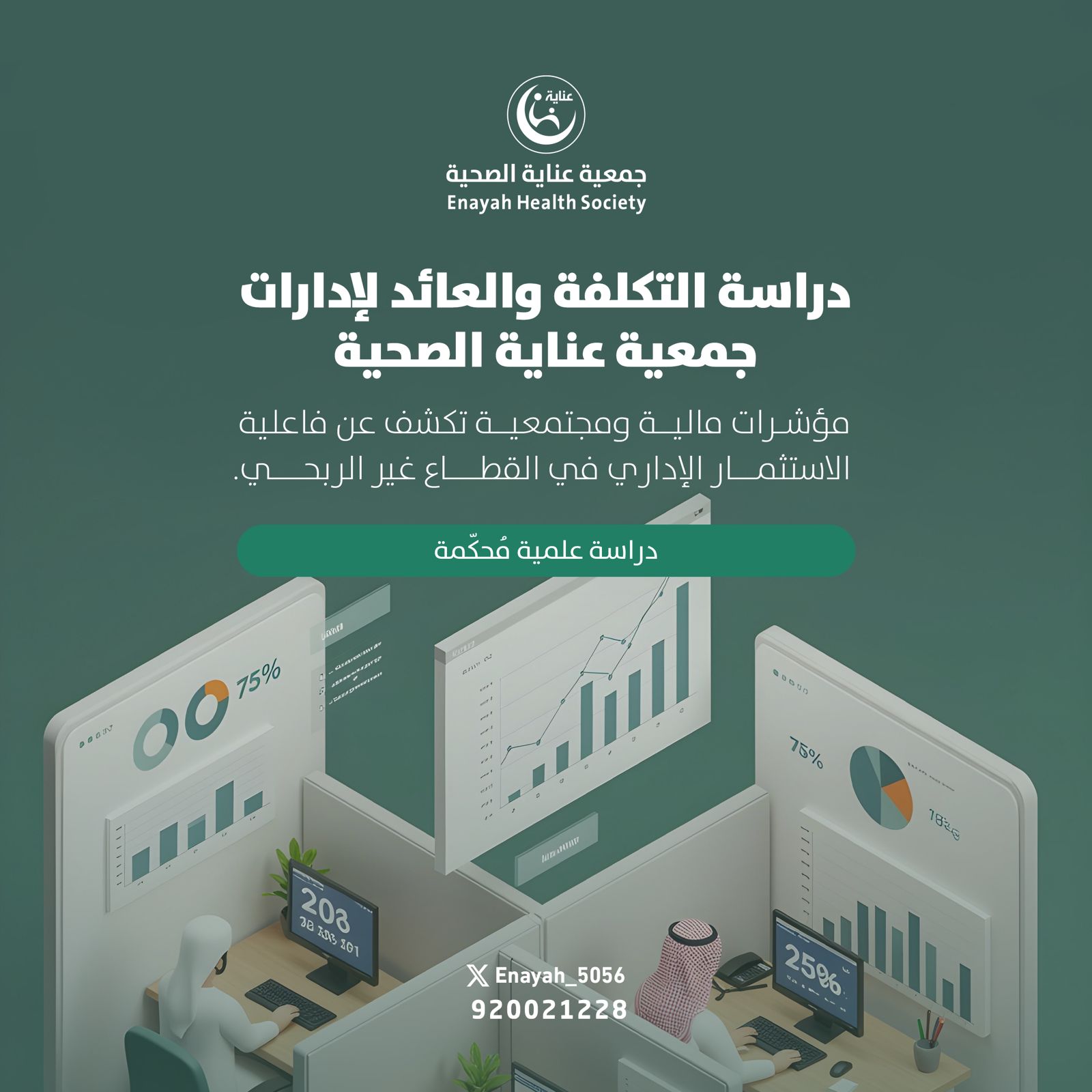 أطلقت  جمعية عناية  الصحية دراسة نوعية هي الأولى من نوعها ضمن القطاع غير الربحي الصحي، تعتمد على منهجية "التكلفة والعائد" لقياس كفاءة الإدارات والموظفين وفق القيم الاقتصادية للتكاليف والمخرجات، بأسلوب علمي محكّم يهدف إلى تحقيق أعلى درجات الكفاءة والاستدامة.
