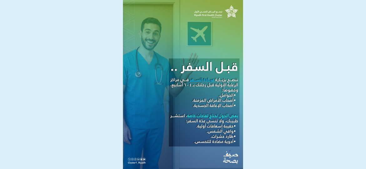وتهدف الحملة إلى تمكين المسافرين والمقيمين من قضاء إجازة صيفية آمنة وصحية، عبر نشر رسائل توعوية وممارسات وقائية تُسهم في الحد من الإصابات المرتبطة بالحرارة، والتسمم الغذائي، والإجهاد الحراري، إلى جانب تسليط الضوء على دور عيادة السفر في مراكز الرعاية الصحية الأولية، التي تقدم خدمات وقائية وإرشادات صحية للمسافرين إلى وجهات محلية ودولية.