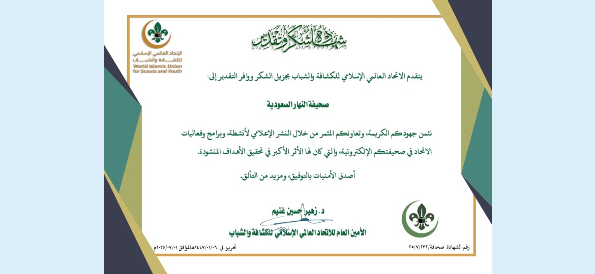 منح الاتحاد العالمي الإسلامي للكشافة والشباب شهادة شكر وتقدير إلى «صحيفة النهار السعودية»، وذلك تقديرًا لجهودها الإعلامية المتميزة وتعاونها المثمر في دعم أنشطة وبرامج الاتحاد عبر منصتها الإلكترونية.