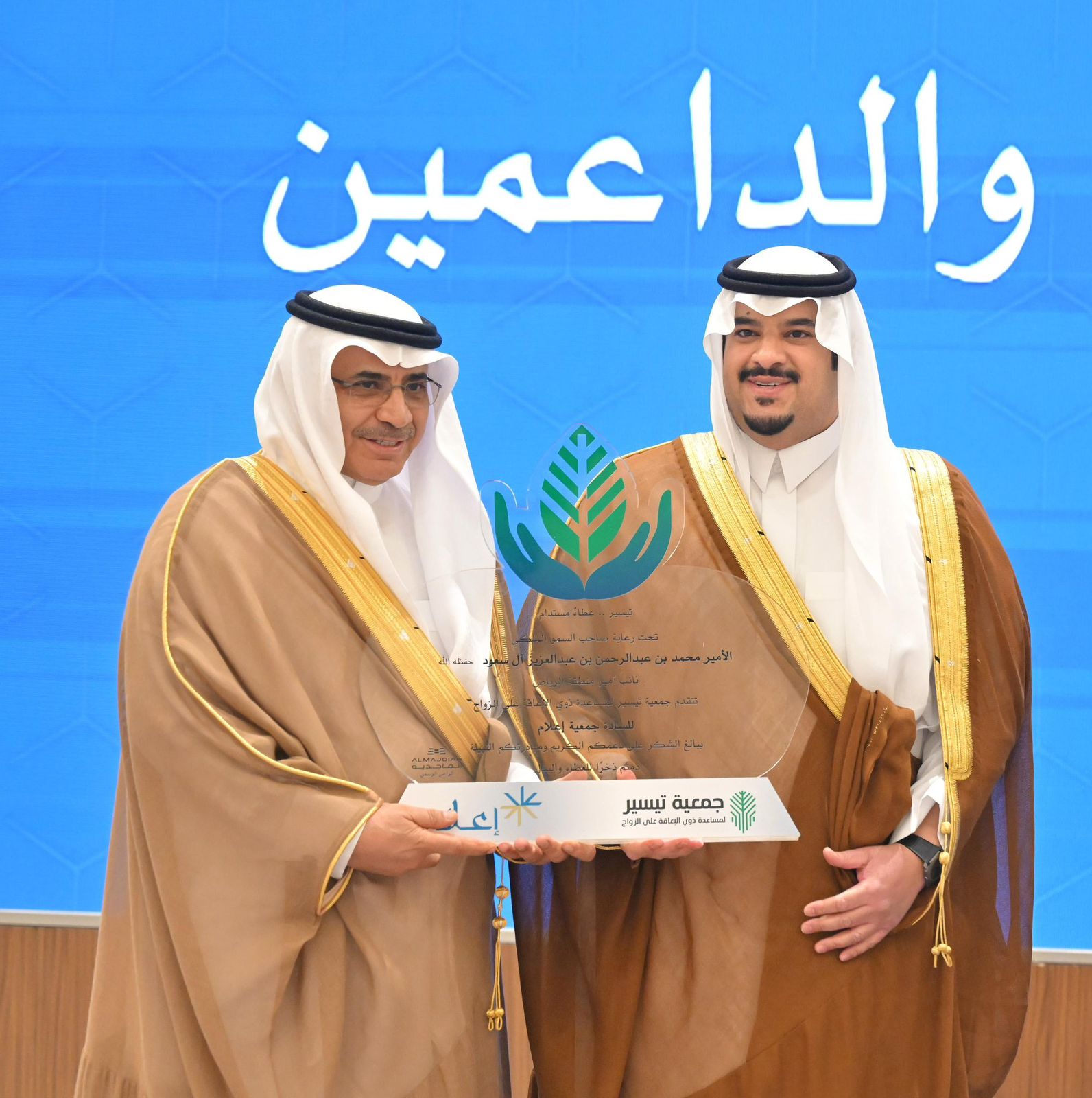كرّم صاحب السمو الملكي الأمير محمد بن عبدالرحمن بن عبدالعزيز نائب أمير منطقة الرياض جمعية الإعلاميين السعوديين- إعلام، تقديراً لمساهماتها في خدمة القطاع غير الربحي، من خلال الدعم الإعلامي لجهود جمعية (تيسير) التي تسعى إلى تمكين ذوي الإعاقة ومساعدتهم على الزواج، في إطار هدف إنساني نبيل يهدف إلى تعزيز استقرارهم الاجتماعي والنفسي، وتحقيق اندماجهم في المجتمع.