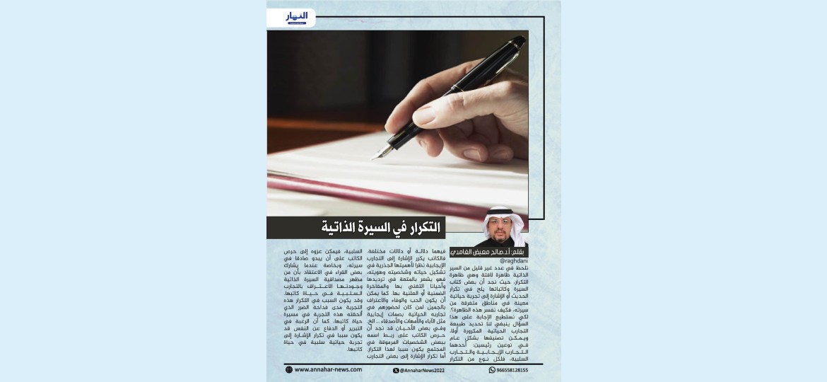 نلحظ في عدد غير قليل من السير الذاتية ظاهرة لافتة وهي ظاهرة التكرار، حيث نجد أن بعض كتاب السيرة وكاتباتها يلح في تكرار الحديث أو الإشارة إلى تجربة حياتية معينة في مناطق متفرقة من سيرته، فكيف نفسر هذه الظاهرة؟.