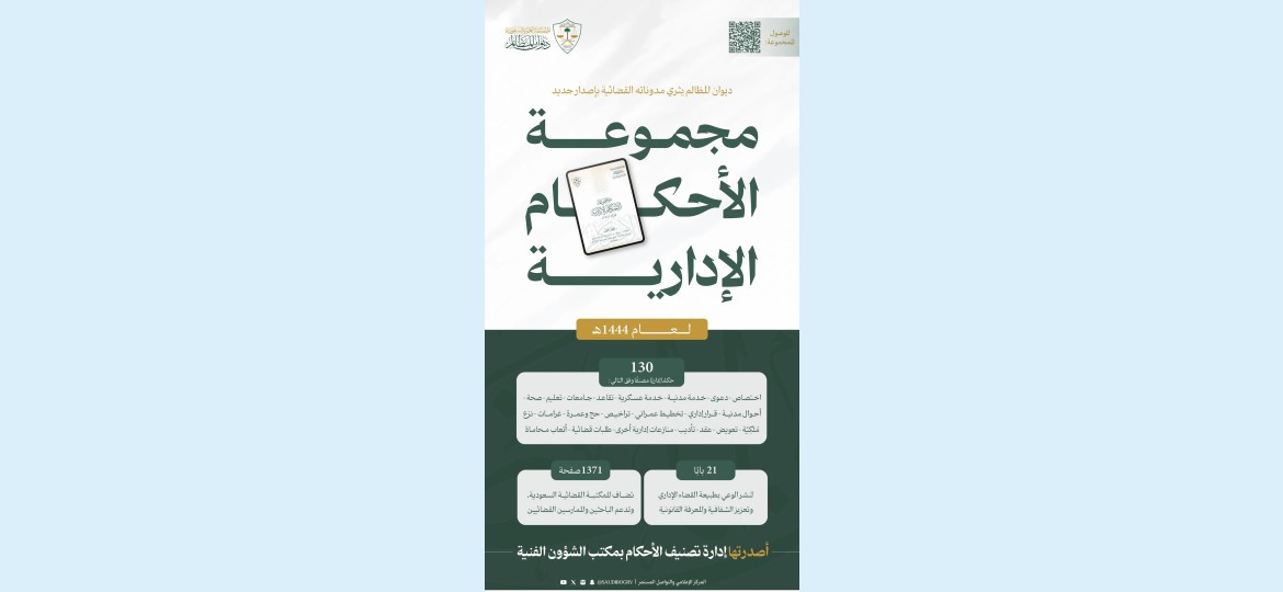 أعلن  ديوان المظالم  ممثلًا في إدارة تصنيف الأحكام بمكتب الشؤون الفنية، عن إصدار مجموعة  الأحكام الإدارية  لعام 1444هـ عبر بوابته الرقمية، وتضم هذه المجموعة ما تم اعتماده وتصنيفه من الأحكام الصادرة عن دوائر الاستئناف في محاكم القضاء الإداري بمختلف مناطق المملكة، باختلاف تصنيفاتها ووقائعها وما صدر بشأنها من أحكام.