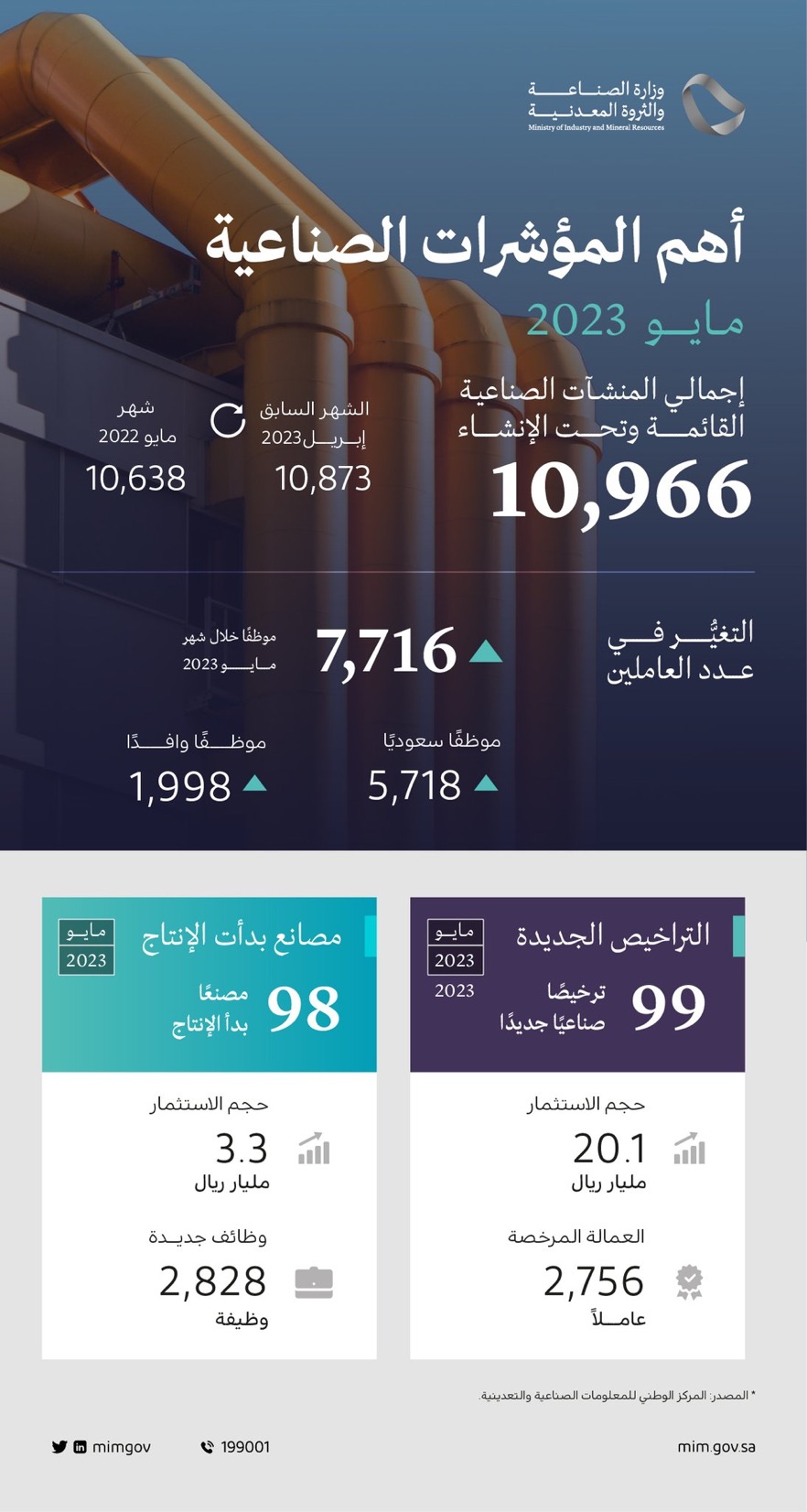 أكد وزير الصناعة والثروة المعدنية بندر إبراهيم الخريف أن القطاع الصناعي يواصل نشاطه تصاعديًا، حيث تمكن من جذب حوالي 23 مليار ريال خلال شهر مايو الماضي، تمثل حصيلة حجم الاستثمارات في التراخيص الجديدة والمصانع التي بدأت الإنتاج؛ الأمر الذي يؤكد على جاذبية القطاع وانفتاحه لاستقبال المزيد من المشاريع الصناعية النوعية والمبتكرة.