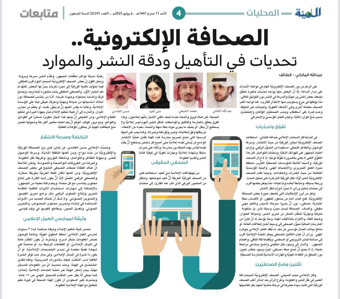 أكد المستشار الإعلامي رئيس تحرير صحيفة النهار السعودية عبدالله الكناني، أن الصحف الإلكترونيَّة استطاعت تجاوز الصحف الورقيَّة من حيث الانتشار، وسرعة الوصول، والتفاعل اللحظي، مستفيدة من التحوُّل الرقمي، وتزايد اعتماد الجمهور على الهواتف الذكيَّة، ومنصَّات التواصل، لكن هذا التفوُّق الكمي لا يعني بالضرورة تفوُّقًا نوعيًّا.