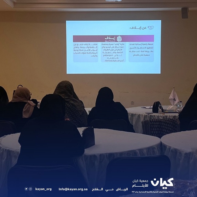 أنه من هذا المنطلق المبارك، دشّنت جمعية كيان للأيتام ذوي الظروف الخاصة منصة "إيلاف" لتكون بابًا مشرعًا للتوفيق بين شخصين يجمعهما حلم تكوين أسرة مستقرة. ولم تأتِ هذه المنصة كخدمة إلكترونية عابرة، بل جاءت كرسالة إنسانية رائدة تهدف إلى تسهيل اللقاء الحلال، وتمكين الأيتام وغيرهم من الباحثين عن شريك العمر من بناء حياة زوجية سعيدة على أسس من الوضوح والاحترام والاختيار السليم. ومنصة "إيلاف" هي امتداد لجهود جمعية كيان في تمكين أبنائها وفتح آفاق جديدة أمامهم، لتكون بذلك جسرًا صادقًا يعبر به الكثيرون نحو شاطئ السعادة والاستقرار.