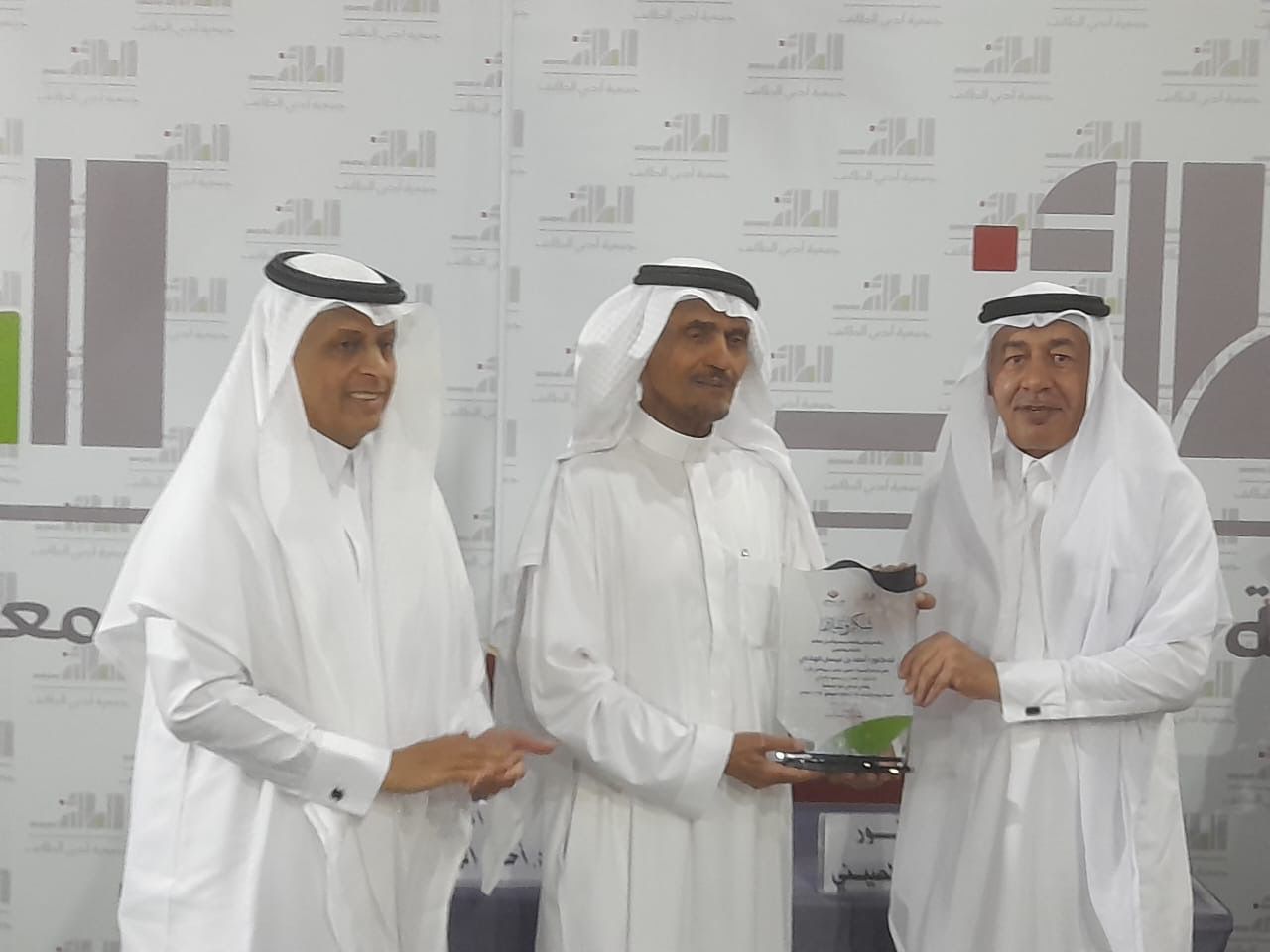 ثم تشارك رئيس الجمعية الأستاذ عطا الله الجعيد، وعضو مجلس الشورى الأستاذ سليمان الزايدي تكريم الضيف، ومدير الأمسية، لتختم الأمسية بتوقيع د. الصيني للكتاب.