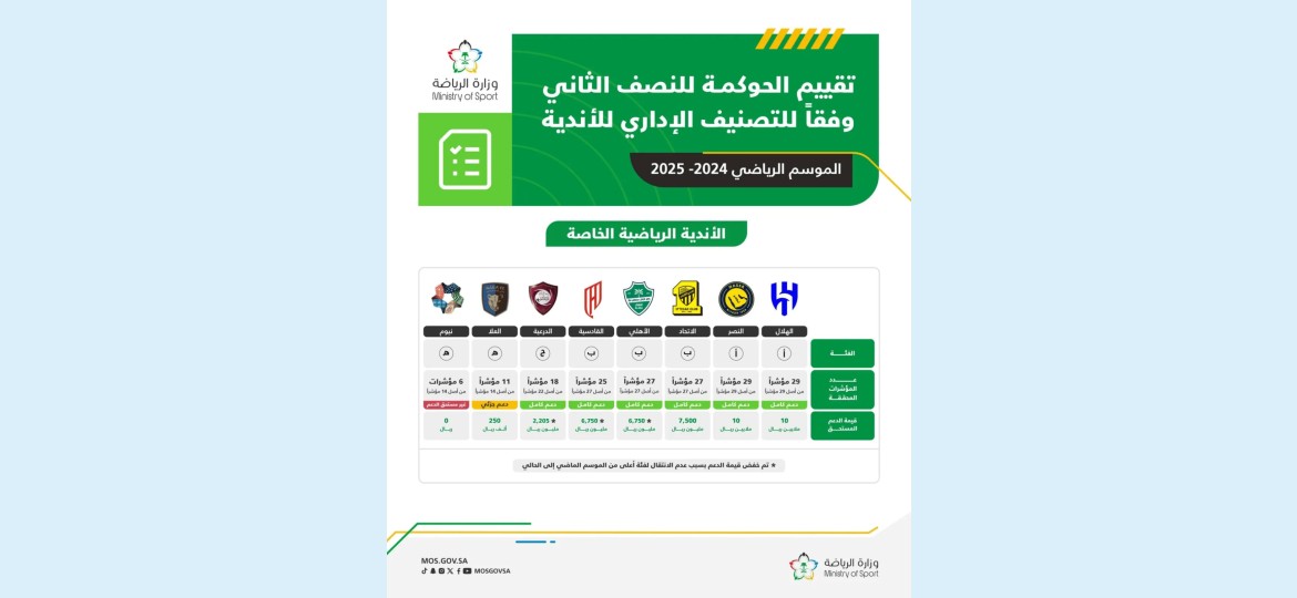 أعلنت وزارة الرياضة، اليوم الأربعاء، نتائج تقييم الحوكمة للنصف الثاني من الموسم الرياضي 2024-2025، والتي كشفت عن تصنيفات الأندية الرياضية الخاصة والعامة وفقاً لمستوى التزامها بالحوكمة والشفافية والمعايير الإدارية.