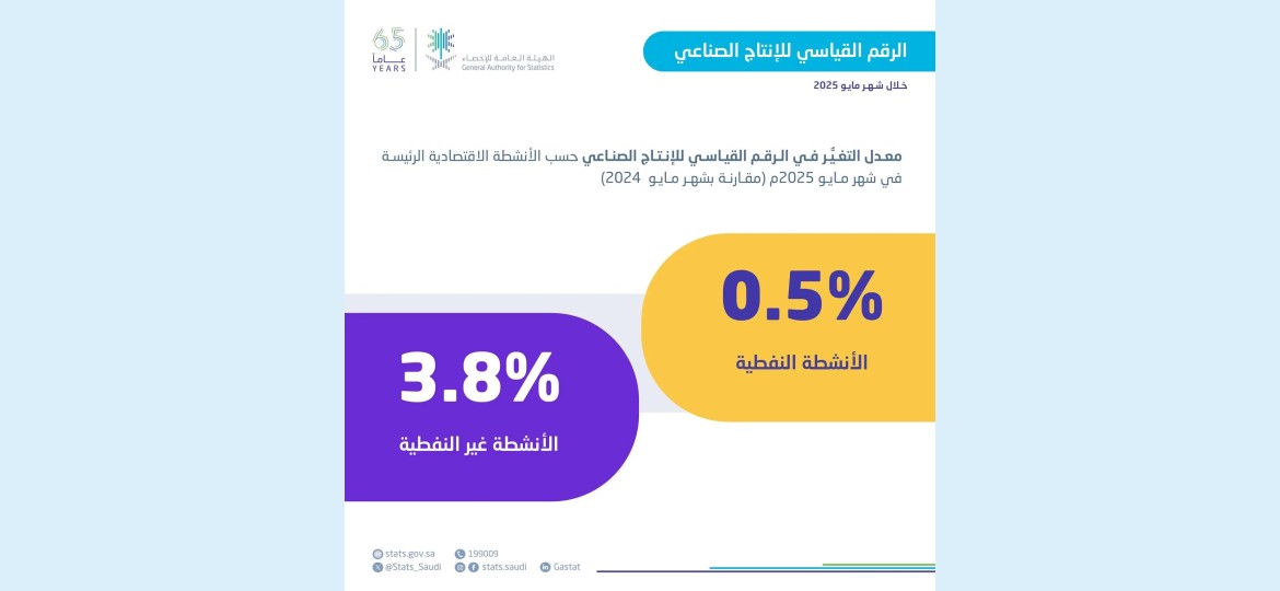 ارتفع مؤشر الرقم القياسي لكميات الإنتاج الصناعي بنسبة (1.5%) خلال شهر مايو من عام (2025م) مقارنةً بالشهر المماثل من العام السابق في مايو (2024م)، مدعومًا بارتفاع نشاط التعدين واستغلال المحاجر، ونشاط الصناعة التحويلية، ونشاط إمدادات المياه، وأنشطة الصرف الصحي، وإدارة النفايات ومعالجتها، وذلك وفقًا لنشرة  الرقم القياسي للإنتاج الصناعي  الصادرة من الهيئة العامة للإحصاء.