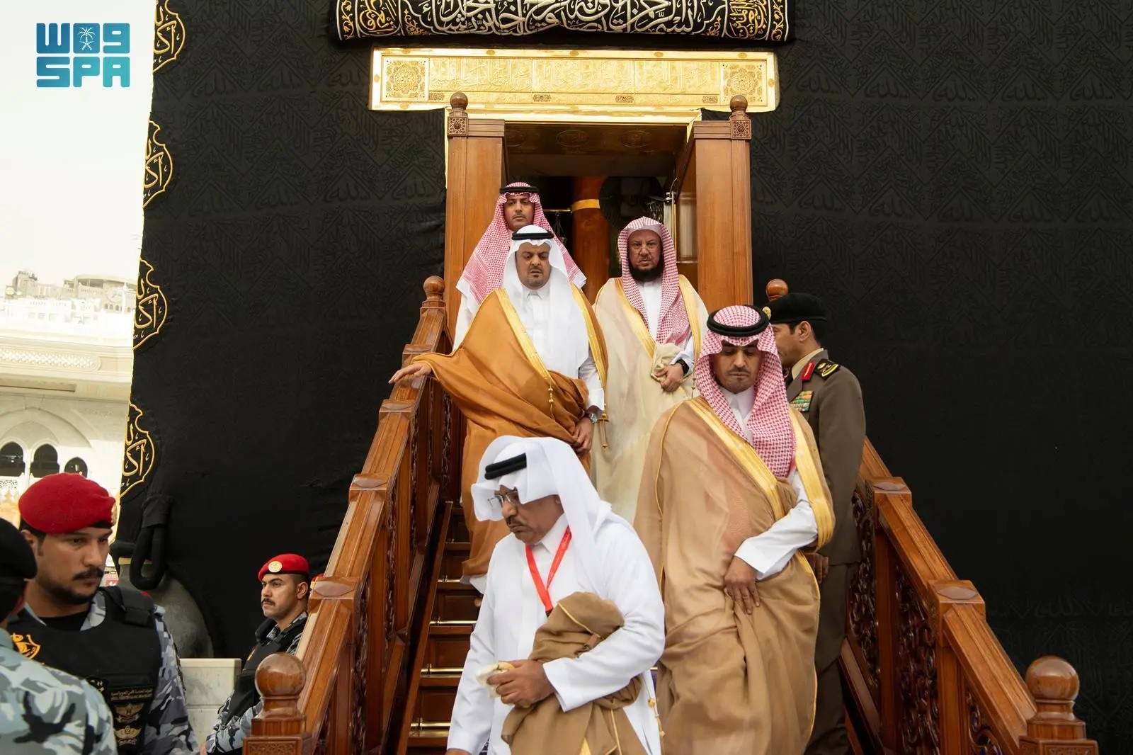 وفور وصول سموّه قام بغسل الكعبة المشرفة من الداخل بماء زمزم المخلوط بماء الورد، وذلك بتدليك جدار الكعبة المشرفة من الداخل بقطع القماش المبللة بالمخلوط، الذي يُحضّر منذ وقت مبكر من قبل الهيئة العامة للعناية بشؤون المسجد الحرام والمسجد النبوي.