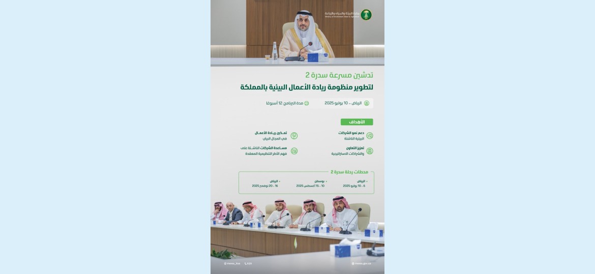 دشّن معالي نائب وزير البيئة والمياه والزراعة المهندس منصور بن هلال المشيطي بمقر الوزارة بالرياض "مسرعة سدرة 2”؛ وذلك بهدف تطوير منظومة ريادة الأعمال في قطاع البيئة بالمملكة وفق مستهدفات رؤية المملكة 2030.