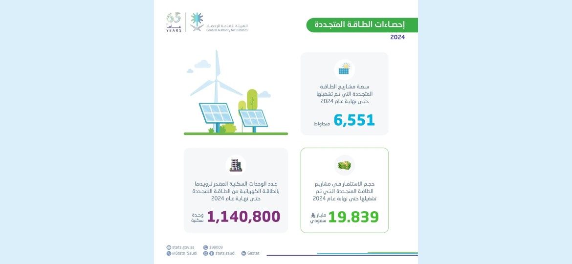 وأفادت نتائج النشرة أن إجمالي عدد الوحدات السكنية المقدر تزويدها بالطاقة الكهربائية من  مشاريع الطاقة المتجددة  التي تم تشغيلها حتى نهاية عام 2024 بلغ نحو 1,140,800 وحدة سكنية.