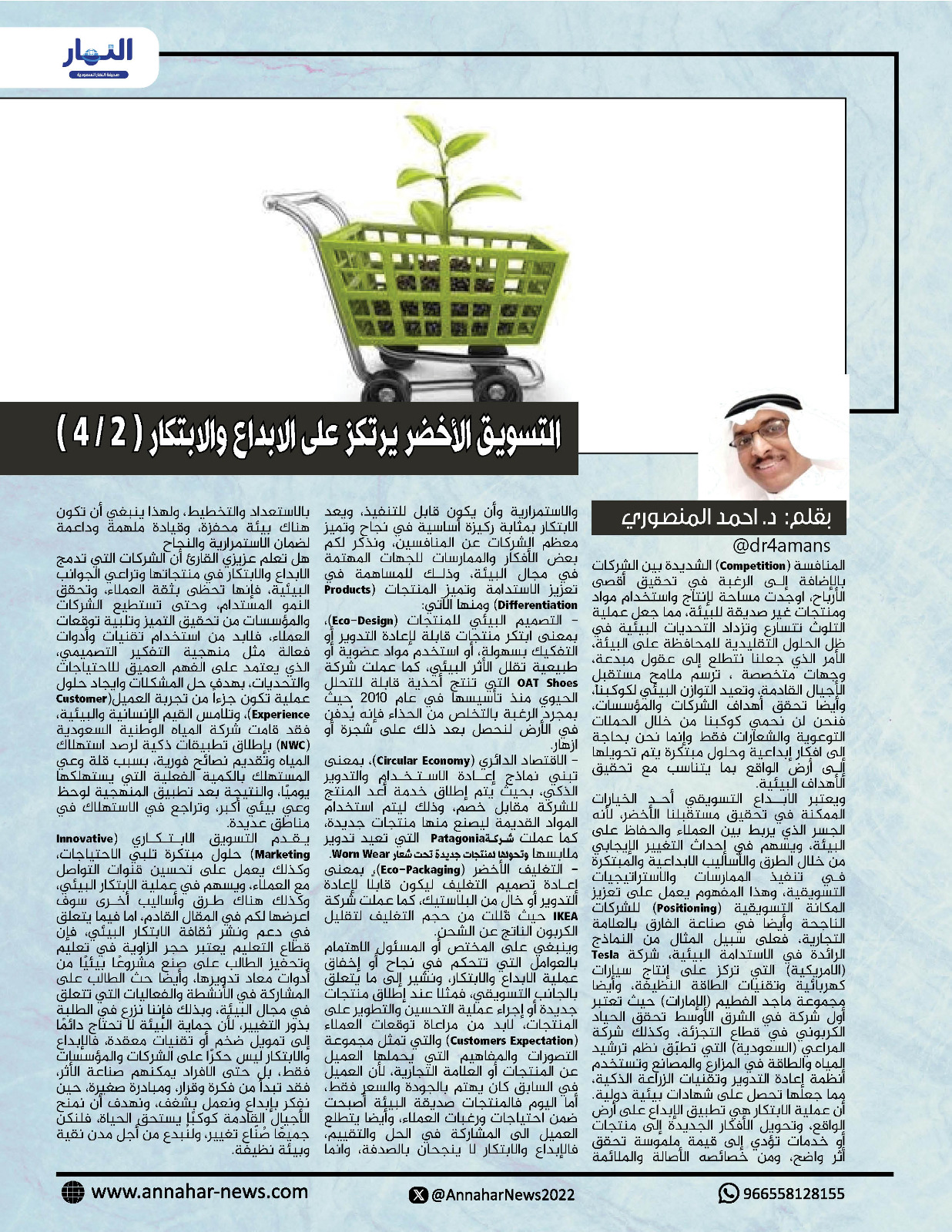 ويعتبر الابداع التسويقي أحد الخيارات الممكنة في تحقيق مستقبلنا الأخضر، لأنه الجسر الذي يربط بين العملاء والحفاظ على البيئة، ويسهم في إحداث التغيير الإيجابي من خلال الطرق والأساليب الابداعية والمبتكرة في تنفيذ الممارسات والاستراتيجيات التسويقية، وهذا المفهوم يعمل على تعزيز المكانة التسويقية (Positioning) للشركات الناجحة وأيضا في صناعة الفارق بالعلامة التجارية، فعلى سبيل المثال من النماذج الرائدة في الاستدامة البيئية، شركة Tesla (الامريكية) التي تركز على إنتاج سيارات كهربائية وتقنيات الطاقة النظيفة، وأيضا مجموعة ماجد الفطيم (الإمارات) حيث تعتبر أول شركة في الشرق الأوسط تحقق الحياد الكربوني في قطاع التجزئة، وكذلك شركة المراعي (السعودية) التي تطبّق نظم ترشيد المياه والطاقة في المزارع والمصانع وتستخدم أنظمة إعادة التدوير وتقنيات الزراعة الذكية، مما جعلها تحصل على شهادات بيئية دولية.