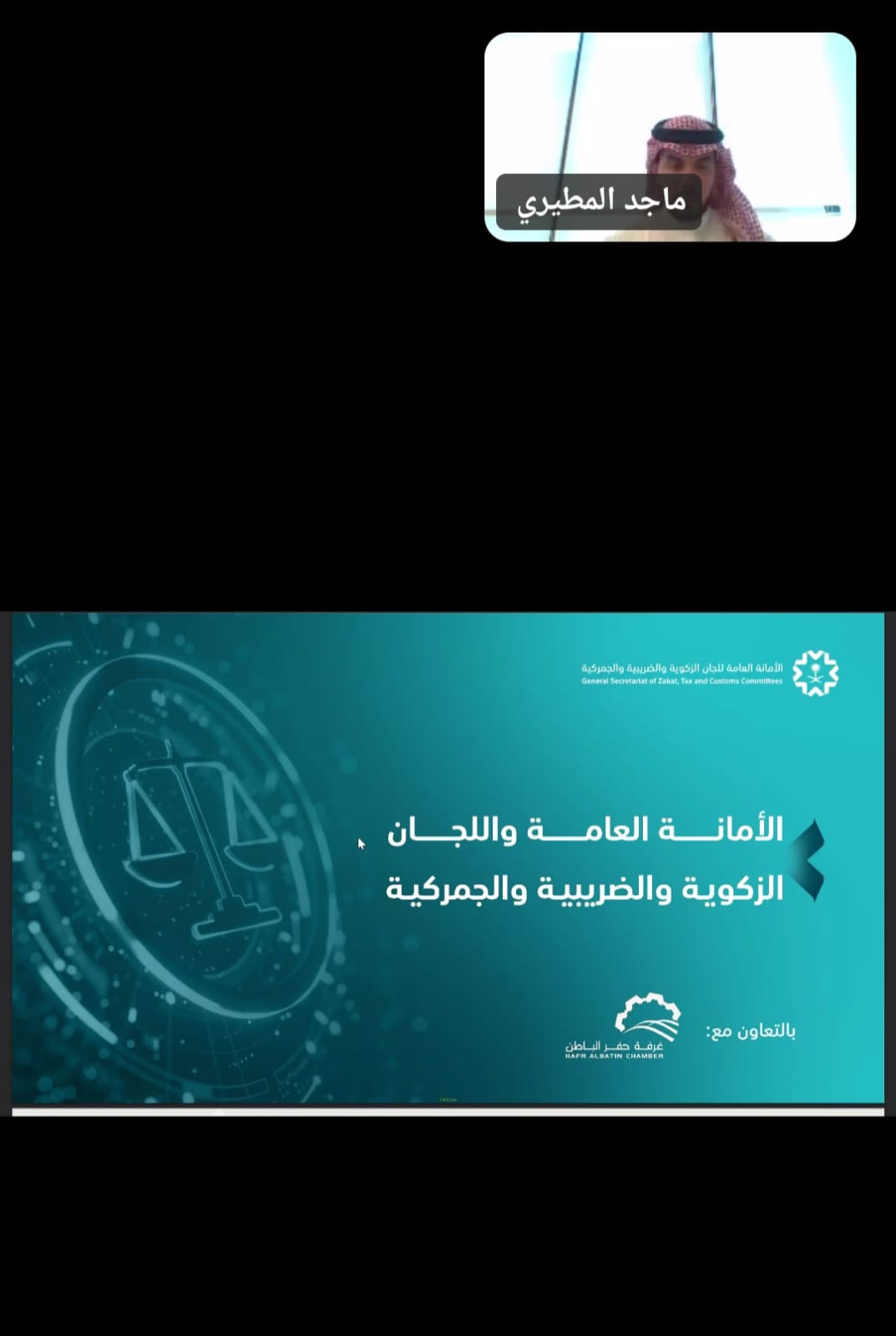 نظّمت غرفة حفرالباطن، مساء اليوم، ورشة عمل عن بُعد بعنوان "أعمال الأمانة العامة واللجان في مجالات الزكاة والضريبة والجمارك"، وذلك بالتعاون مع الأمانة العامة واللجان المختصة في هذه المجالات.