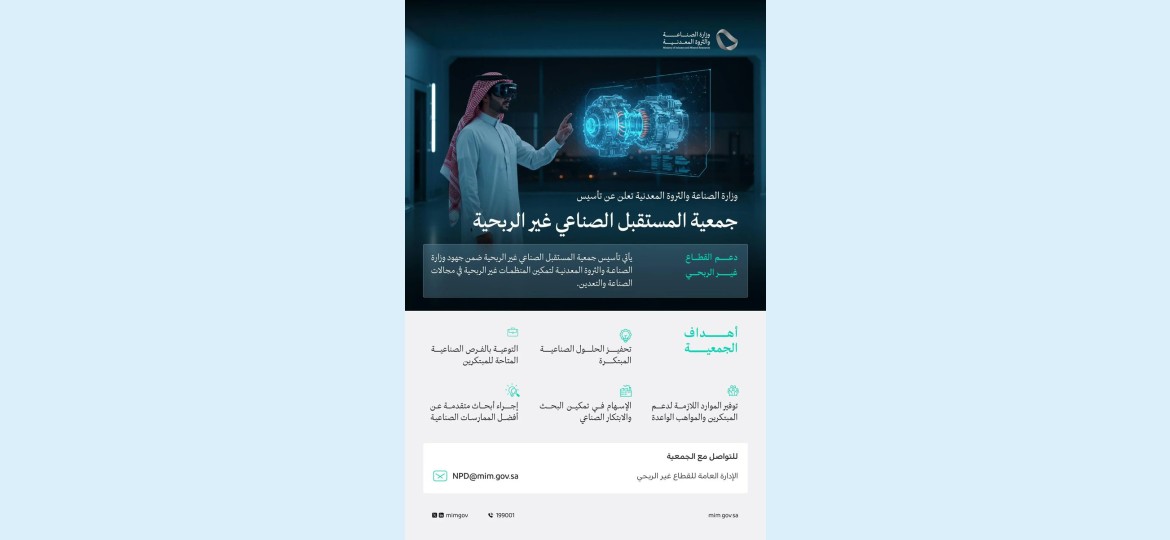 يذكر أن تأسيس جمعية المستقبل الصناعي غير الربحية، يأتي ضمن جهود وزارة الصناعة والثروة المعدنية؛ لتمكين القطاع غير الربحي، وتعزيز دوره في مجالات الصناعة والتعدين، وزيادة إسهاماته وأثره المباشر في إجمالي الناتج المحلي للاقتصاد الوطني، وفقًا لمستهدفات رؤية المملكة 2030.