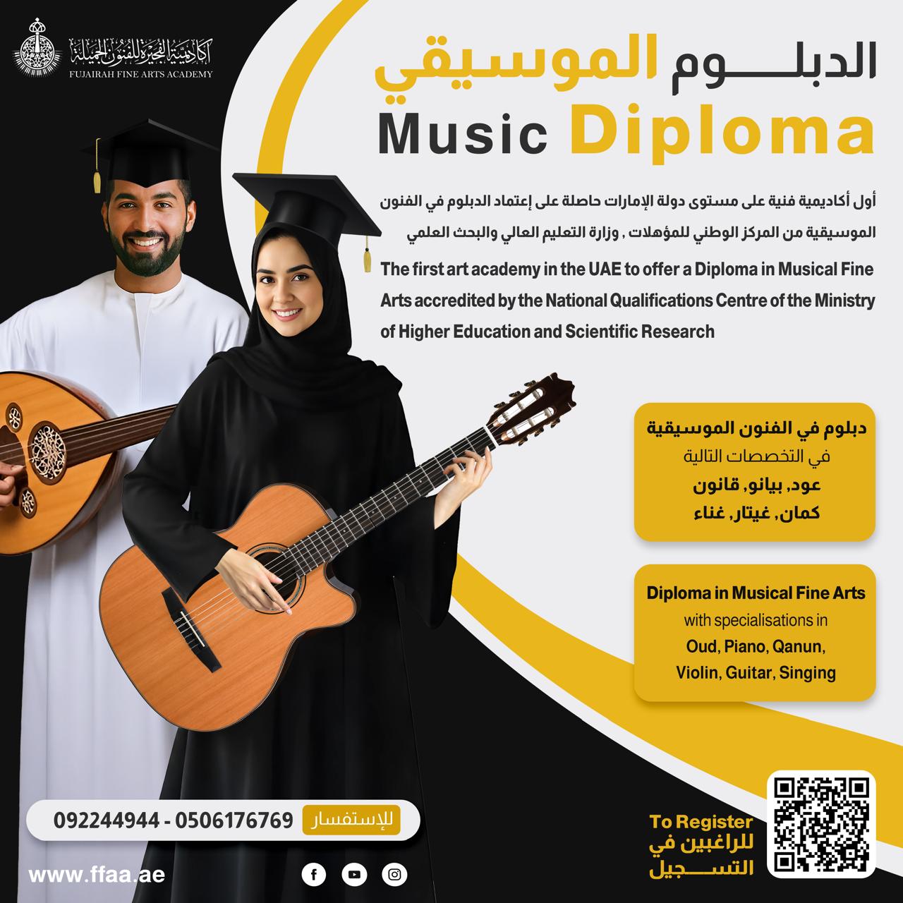 أعلنت  أكاديمية الفجيرة  للفنون الجميلة خلال مؤتمر صحفي عُقد في مدينة الإبداع – الفجيرة، عن إطلاق دبلوم الفنون الموسيقية، الأول من نوعه في دولة الإمارات والمعتمد من المركز الوطني للمؤهلات – وزارة التعليم العالي والبحث العلمي.