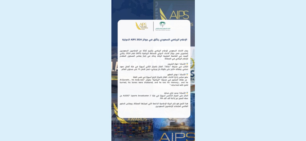 حقق الإعلام الرياضي السعودي حضورًا مشرفًا في جوائز الاتحاد الدولي للصحافة الرياضية (AIPS) لعام 2024، التي أُقيمت في العاصمة المغربية الرباط، حيث تم تكريم ثلاثة من الإعلاميين السعوديين المتميزين، في إنجاز يعكس التطور الكبير الذي يشهده الإعلام الرياضي في المملكة.