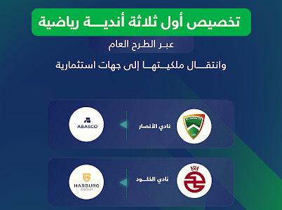 أعلنت وزارة الرياضة، اليوم الخميس 24 يوليو 2025م، وبالتعاون مع المركز الوطني للتخصيص، تخصيص أول ثلاثة أندية رياضية سعودية، عبر الطرح العام، وهي أندية: (الأنصار، والخلود، والزلفي)، وانتقال ملكيتها إلى جهات استثمارية، وذلك بعد أن تم الإعلان في أغسطس من عام 2024م عن طرح ستة أندية للتخصيص، وهي: (الأنصار، والأخدود، والخلود، والزلفي، والعروبة، والنهضة)، ضمن المسار الثاني لمشروع الاستثمار والتخصيص للأندية الرياضية.